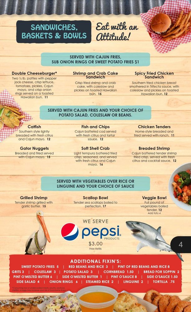 One of the highlights of the menu is the delicious appetizers like the Fried Oysters and Clam Strips, both served with fresh citrus and cocktail sauce. For soup and salads, don't miss out on the flavorful Gumbo and Boston style Clam Chowder. Sandwich lovers will adore the Spicy Fried Chicken Sandwich and Crab Cake Sandwich.